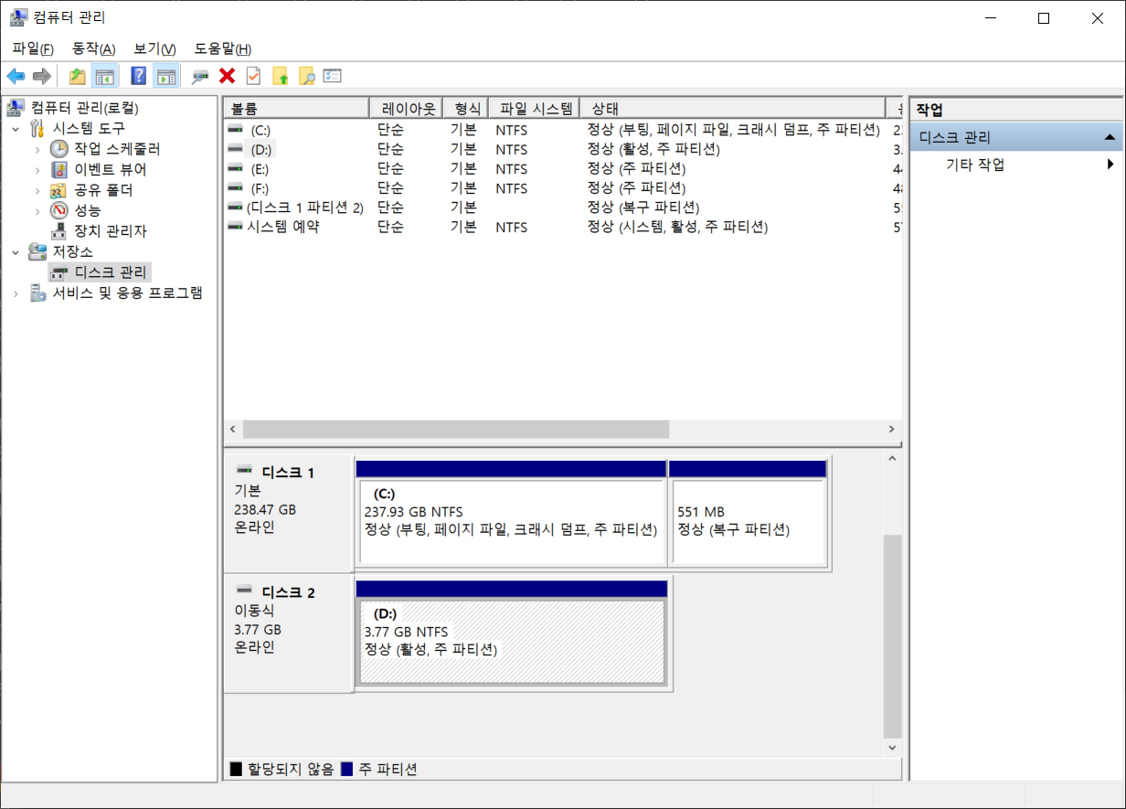 그럴 경우 Windows 의 컴퓨터 관리의 디스크 관리를 들어가도 format 이 되지 않는 경우가 발생할 수 있으며 이러한 상황에 정상적인 USB 저장공간 사용을 위해 Disk Part 로 초기화 할 수 있습니다.